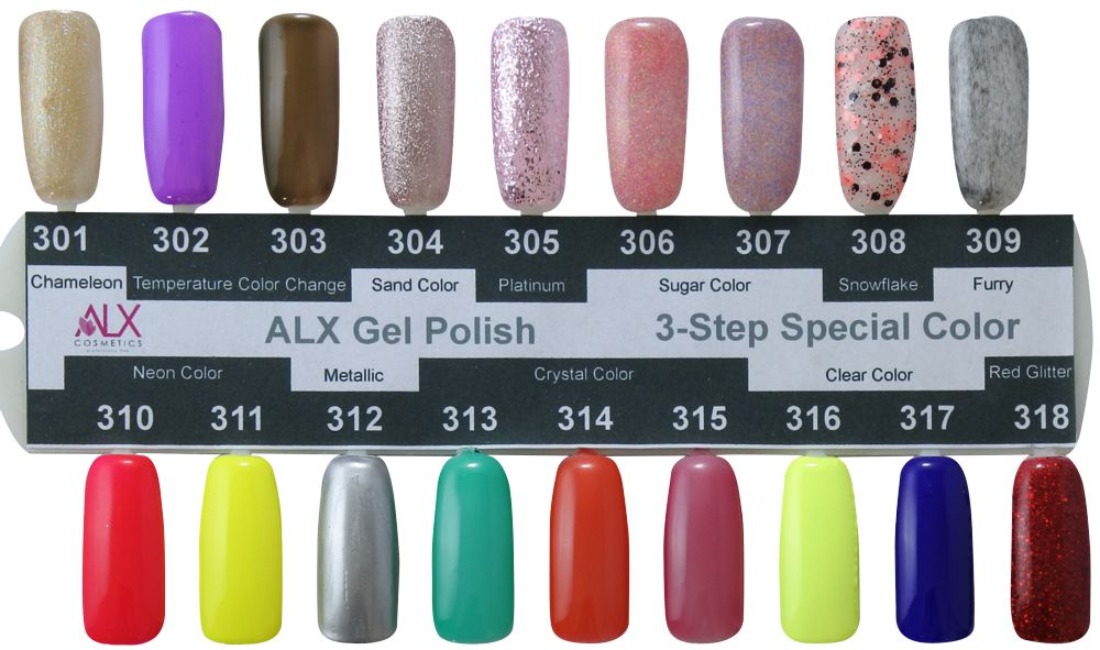 Μαζί με τα νέα καλοκαιρινά χρώματα, ήρθαν και τα νέα τριφασικά χρώματα με special εφέ. Η νέα σειρά ALX Gel Polish – 3 Step, είναι τριφασικά ημιμόνιμα, που χρειάζονται βάση και τοπ. Οι κωδικοί αυτοί είναι από το 301 έως το 318.